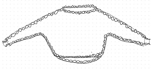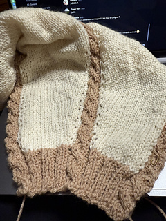 • Modèle C : dos arrondi et devant droit La hauteur des pans se situe au dessus des hanches. Une première torsade court d’un poignet à l’autre tout le long de la manche et des bordures inférieures. Une seconde torsade va du milieu du poignet , souligne l’épaule, se divise sur l’encolure pour terminer sur l’autre poignet en soulignant la deuxième épaule. Grâce à ces torsades, vous n’aurez pas de bordure supplémentaire ni de col à tricoter à la fin de votre ouvrage Il nécessitera une couture pour fermer les manches et les côtés.