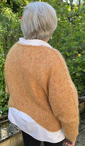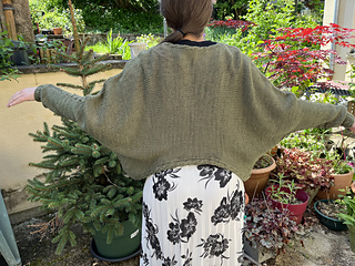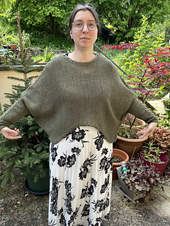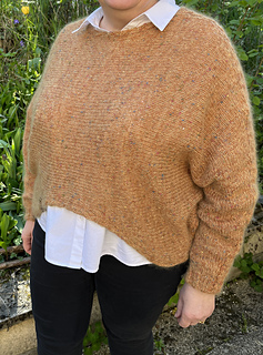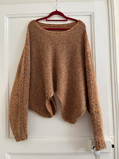 Ce « sur-pull » court, aux manches chauve souris, se tricote en aller-retour, d’une seule pièce d’une manche à l’autre. Dos et devant sont incurvés à la limite de la ceinture et les pans latéraux atteignent les hanches.