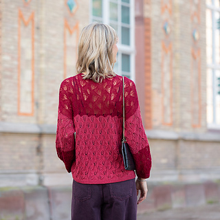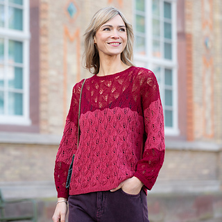 The tone-in-tone LEAF WHISPER sweater is worked in two different yarn qualities from the bottom up in a decorative leaf pattern. You first work in the round up to the underarms, then separate the front and back sections and continue working in rows. The back section is finished straight; the front section incorporates short rows to shape the neckline. The body begins with subtly shiny Saffira yarn and finishes in the upper shoulder section with delicate, fluffy Alpaca Lace. The leaf pattern is repeated in the sleeves, working from the top down in rounds, directly from the armholes. You pick up stitches in Saffira yarn and work decreases for shaping on the underside of the sleeves. The sleeves also repeat the change in yarn quality, finishing in Alpaca Lace.