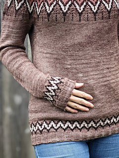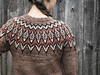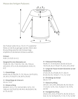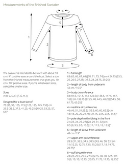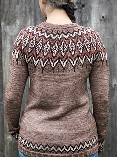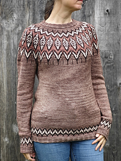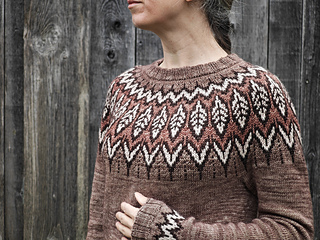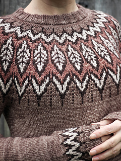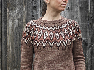 Der Leafline Sweater wird nahtlos von oben nach unten in Runden gestrickt. Er fängt mit einem Halsausschnitt in doppelt gefaltetem 3/3-Rippenmuster an. Danach kommt eine Rundpasse in einem Farbmuster mit Blattmotiv, das mehrheitlich mit 3 Farben gleichzeitig gestrickt wird. Das Muster hat verkürzte Reihen am Rücken nach dem Joch, um den hinteren Halsausschnitt anzuheben, und ein passendes Farbmuster für Saum und Ärmel. Der Körper wird ohne Taillierung gestrickt. Er soll mit einer positiven Weite von ca. 10 cm um die Brust getragen werden. Die abgebildeten Muster sind in Grösse B mit einer Brustweite von 86 cm gestrickt.