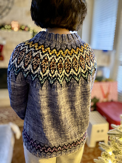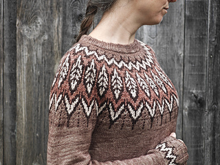 The Leafline Sweater is worked seamlessly in the round from the top down. It begins with a neckline in a double folded 3/3 ribbing. This is followed by a circular yoke in a colorwork pattern with a leaf motif which is mostly knitted with 3 colors at the same time. The pattern features short rows in the back after the yoke for raising the back neck and a matching colorwork motif for hem and sleeves. The body is worked without any waist shaping. It is intended to be worn with approx. 10 cm / 4” positive ease around the bust. The shown samples are worked in Size B on a 86cm / 33.75” bust.