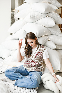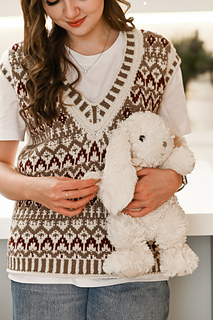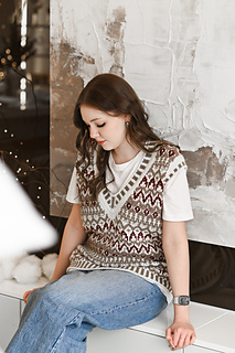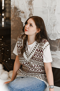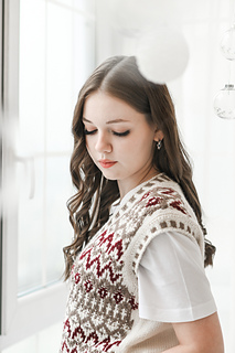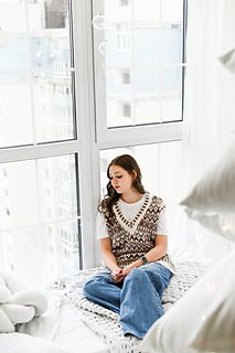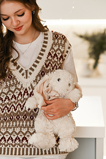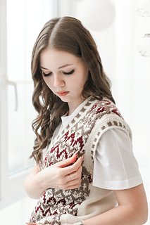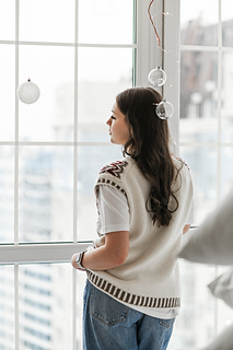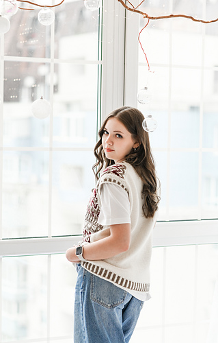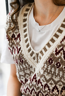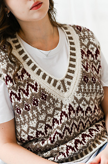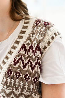 “Lebkuchenhäuschen” (Gingerbread house) vest is worked in separate parts from the neck down. First, the Back is worked, then stitches for the Fronts are picked up along the shoulder, and the two halves of the Front with are first worked separately, then joined to each other after shaping of the V-neckline. Back and Front are joined after armhole shaping has been completed. Neckline edge and armhole edges are finished with ribbing.