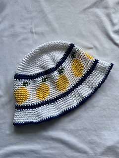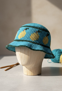 The Lemon Bucket Hat is an intermediate crochet pattern worked primarily in single crochet with a 5mm hook with tapestry crochet to design the lemon motif. The result is a light classical bucket shaped hat.