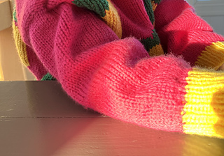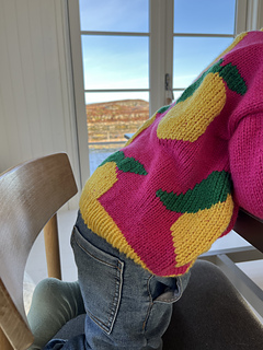The sweater is knit bottom-up. The hem and body is first knitted with circular needles, then divided into front and back pieces that are worked flat, separately. The shoulder seams are then sewn together, and sleeve stitches are picked up along the armholes to create sleeves which are then knit top-down. Stitches are then picked up to create a neckline to finish. The motif can either be knitted (catch every 5th stitch around), or added after knitting by using the duplicate stitch.