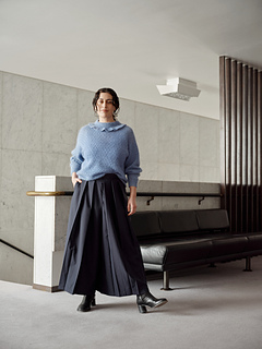 This cosy sweater by María Uzquiano, also known as mûmû knit, has a wavy texture pattern that is created by combining knit and purl stitches. The end result is fluffy and warm – the perfect knit for the colder seasons! María’s words: “I imagined a minimalist silhouette with great texture, then I thought of ‘feminine’ and ‘soft’ before starting the sketches. All of it took me to this sweater, called Lempeä, the Finnish word for gentle, because this is the exact feeling when you get to wear it.”