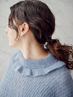 Needles: US 4 / 3.5 mm 40” / 100 cm circular needles (for body), US 4 / 3.5 mm 16” / 40 cm circular needles or DPNs (for sleeves), US 2.5 / 3 mm 40” / 100 cm circular needles (for body ribbing), US 2.5 / 3 mm 24” / 60 cm circular needles (for frill), US 2.5 / 3 mm 16” / 40 cm circular needles (for collar and cuffs), US 2.5 / 3 mm DPNs (for cuffs, optional).