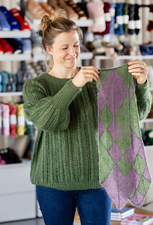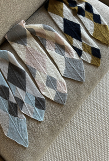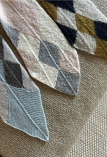 “Leni” is worked in three colors, seamlessly from one tapered end to the other, and consists of several diamonds and triangles in various sizes that are joined together by knitting them on. The diamonds are created by even decreases worked on the right and left sides along a center slip stitch. The triangles running along the outer edges are formed by one-sided decreases. “Leni” is perfect for using up yarn scraps and can, of course, be knitted with more than three colors as desired. A sketch for custom color schemes can be found at the end of the instructions.