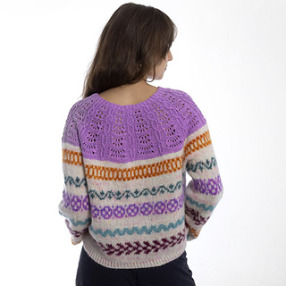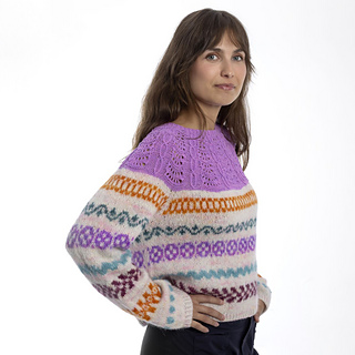 Leonora is a beautiful and colorful blouse that combines lace pattern and stranded colorwork, and the combination of different textures/yarns also makes it something special.