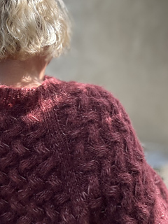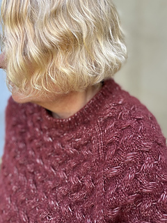 The pullover is knitted in the round in one piece starting with the neck band, followed by short rows for shaping the back of the neck and increases for the sleeves and back/front. At the end of the yoke, the sleeves are separated from the body and the lower body and sleeves finished separately. The main part of the pullover (Back, Front, Sleeves) is knitted in the Elongated Cable Stitch.