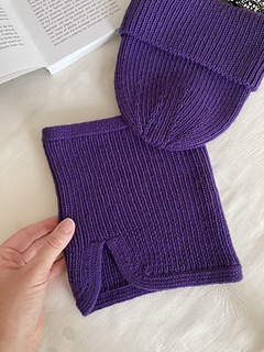 The LET IT SNOW loop is worked from the top down in a k1/p1 rib pattern. It begins in the round using a short circular needle, then is split and worked flat to the desired length. The rounded edges are shaped with right- and left-leaning decreases. Decorative double-knit trims are added at the end for a clean, finished look.