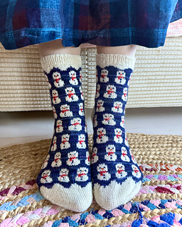 To celebrate this simple joy of building a snowman in winter time, I’ve designed these cheerful snowman socks to keep our toes cosy during the cold, possibly snowy winter months! Knit from the top down with a ribbed cuff, these snowman socks have a short row heel (video tutorial provided). There is a fun, stranded colourwork repeating snowman motif pattern that runs throughout the leg and foot. The motif has three rounds of 3 colours for the carrot nose and scarf. This can be duplicate stitched instead if preferred. This pattern uses the magic loop circular needle method (but can be knit with 23cm (9 inch) circulars or DPNs).