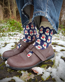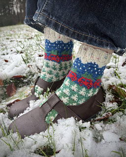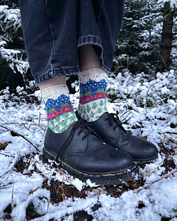 It´s almost Christmas and it´s time to bundle up and drive to the Christmas tree farm to pick out the perfect tree on a snowy, magical evening during Advent time. Knit from the top down, starting with a ribbed cuff, these socks have a short row heel and a fun to knit stranded colourwork pattern, featuring many different sections to depict cars driving through a snowy wood during the build up to Christmas. The design is knit with only two colours in each round. A video tutorial for the heel.This pattern uses the magic loop circular needle method (but can be knit with 23cm (9 inch) circulars or DPNs).