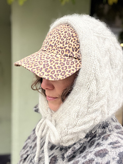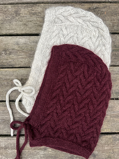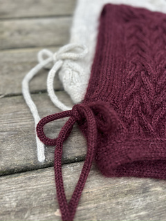 The Let’s Twist Again Balaclava features cables and double-knitted edges. The top of the balaclava is worked back and forth with cables following the chart. Stitches are then picked up along each side where short rows are used to shape the rounded crown. Work continues back and forth down the sides. At the bottom, the work is joined with a backward-loop cast-on, and the neck is worked in the round. A double-knitted edge is worked at the hem as well as around the face opening, where eyelets for a drawstring are incorporated. The drawstring is worked as an i-cord by hand or on a knitting dolly.