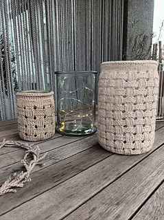 17 - 18 M / 10 cm, für das angegebene Garn, gedehnt gemessen. Du kannst auch andere Garne verwenden und die Höhe und Weite sehr gut dem Glas anpassen.