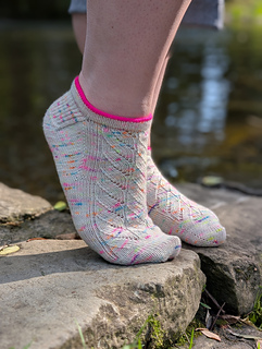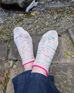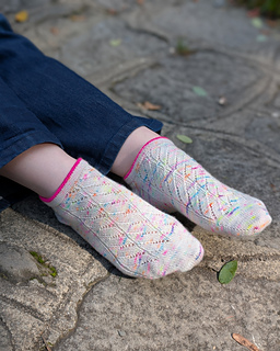 Skarpety zaprojektowano na włóczkę o grubości „fingering”. Swoje skarpety wykonałam w włóczki Woollala Sock Merino (75% wełna merino, 25% nylon; 425 m w 100 g) w kolorach “Colorful Memories” MC oraz „Hot Pink” CC.