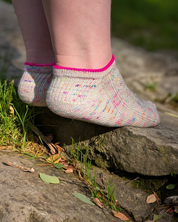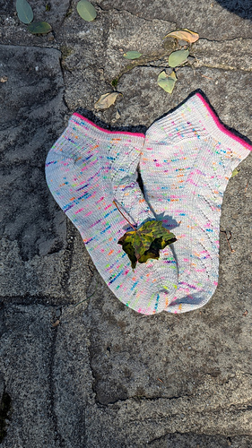 The socks were designed for a fingering weight yarn. I’ve used Woollala Sock Merino (75% merino wool, 25% nylon; 425m 465 yds in 100 g). The sample socks were knit with “Colorful Memories” for the main color and “Hot Pink” for the contrast color in the cuff.