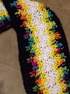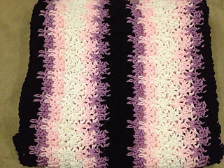 The size and gauge varies some with tension, but makes approximately a 62” by 39” (a little larger than 5’x3’) afghan measured before stretching. This pattern is easy to change if you desire a different size.