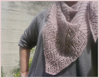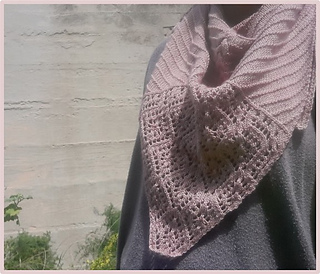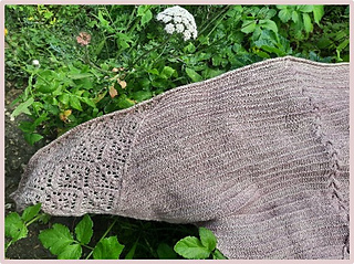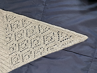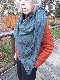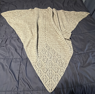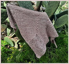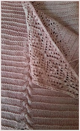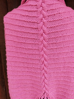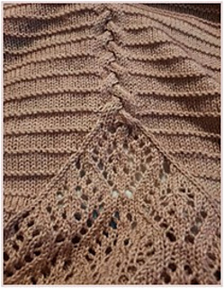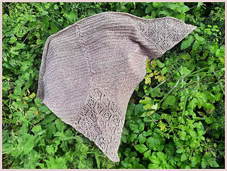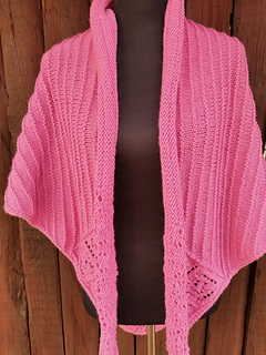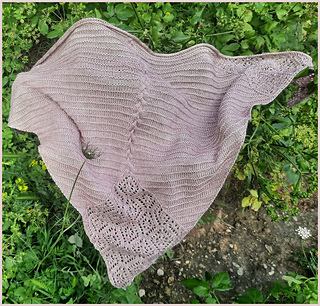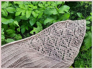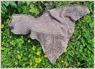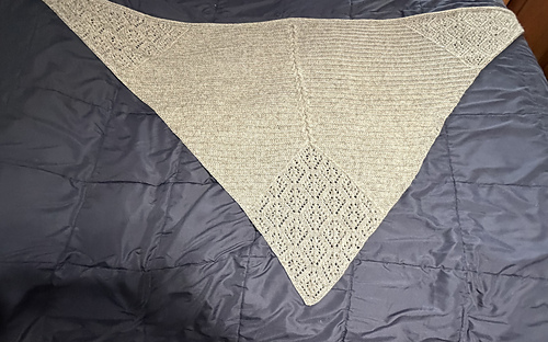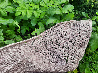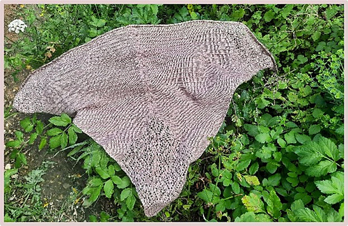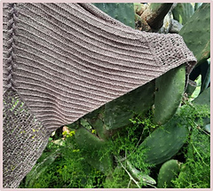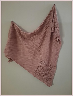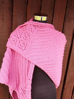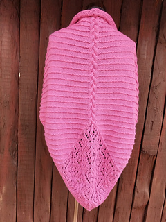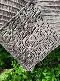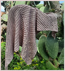 This shawl features sections of lacework with bordering twisted stitches and trailing braid style cables, all framed within a visually linear background of interspaced purl bump rows on a stockinette base, offering both texture and drape.