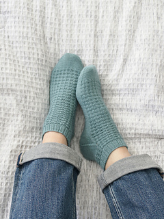 Extra-Small (Small, Medium, Large, Extra-Large)/XS (S, M, L, XL) to fit actual foot circumference 6 (7, 8, 9, 10)”/15.2 (17.8, 20.3, 22.9, 25.4) cm, measured around the ball of the foot (the widest part). Negative ease is built in to the pattern. The length and height are adjustable. If you find that you are in-between sizes, my test knitters found that choosing the smaller size was a better fit due to the stretchiness of the waffle stitch pattern.