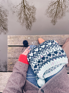 - My first version (the mini prototype) is a size 2 y, and it’s knitted in scraps of Peruvian Highland Wool from Filcolana in the colors Bubblegum/Cobalt blue/a little bit of Ballerina (color A), Ballerina/Alaskan blue (color B) and Slightly purple/Seafoam (neckband/armhole ribbing)