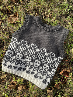 - My second version is a size 3 y. It’s knitted in Jensen Yarn from Isager Yarn in the colors 100 (color A) and 2s (color B and neckband/armhole ribbing).