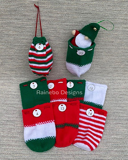 This Lil’ Stuffies Advent Countdown is knit in the round, (Intermediate Level), using Magic Loop (or double pointed needles). Stuffies are approx. 4” tall (without hats) and stuffies and pouches are created using #3-light wt. (DK wt.) yarn. Needles: size 3 (3.25mm) 32” Circular Knitting Needles (if using Magic Loop). The legs, body, arms, and head are all knit on as you work along. There are 24 stuffies (6 each of Gingers, Gnomes, Snow Pals, and Angels) and 24 pouches.