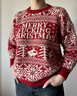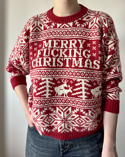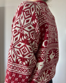 The Lillehammer Christmas Pullover is a cheeky, christmassy rendition of the Lillehammer Pullover. It has all-over stranded colourwork, an 80s inspired oversized fit and a dropped shoulder construction. The pattern is calculated to have around 30 cm of positive ease, with large sleeves to complement the silhouette. The entire pullover is knitted in the round and uses steeking to make that possible.