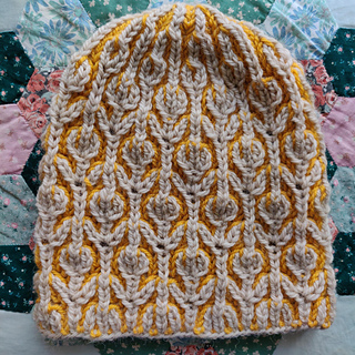 This beanie is an average adult size version (a little bit slouchy) - if you want a bigger or shorter size – do more or fewer sections, more rounds up (brioche plain rounds) or use larger needles. The pattern size matches the beige (Wheat, 61, Drops Alaska) and mustard (Goldenrod, 2923, Drops Nepal) beanie shown. The pattern is fully written and charted.