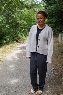 Cardiganen er strikket oppefra og ned med opsamlet ærmer en dobbeltstrikket kant, der går hele vejen rundt i cardiganens åbning. Knapstolpen er dobbeltstrikket og der strikkes knaphuller i undervejs. Cardiganen har et box-fit og afsluttes med brede ribkanter.