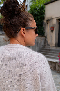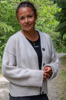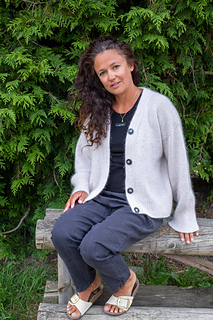 The cardigan is worked top down, the sleeves are added, and a double-knitted edge is worked all the way round the opening of the cardigan. The buttonholes are worked in while working the double-knitted edge. The cardigan has a box-fit with wide rib edges.