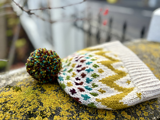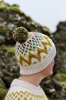This hat is knitted in the round from the brim to the top of the hat with DK weight wool. I used one main color and five contrast color pops. You can use as many contrast colors as you like for a two-color version or a multi-color stashbusting hat. Twisted ribbing forms the folded hem for a double thick warm brim. Stranded colorwork decorates the body of the hat with a simple chevron and cross motif. You can use this hat a gauge swatch for the Lindu Peysa too! Play with colors and find the right needle size to achieve the recommended gauge of 24 stitches in stranded colorwork. Then, you confidently knit the matching sweater called Lindu Peysa next.