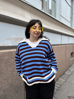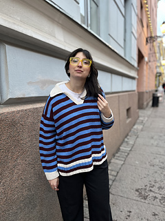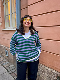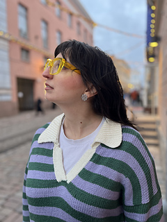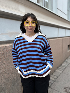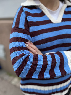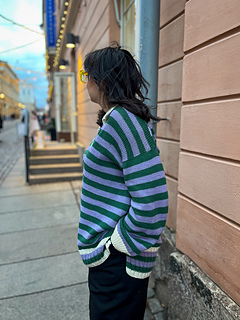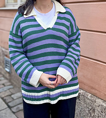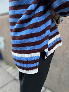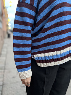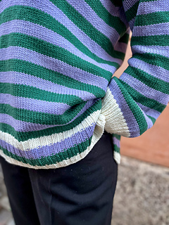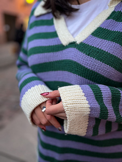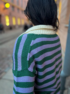 The pullover has a European shoulder, top down construction, featuring a split hem. It has a positive ease of 8-10” / 20-25 cm. The pattern starts by working the back flat. The fronts are picked up from the cast-on edge of the back piece, later on joined with the back and worked till the ribbing is reached. When the ribbing is reached, the work is split into front and back where the ribbing is worked flat. The back ribbing is longer than the front. The plackets are worked once the body is finished and an icord is worked around the neck and part of the plackets. From the icord, stitches are picked up to work the collar. Lastly stitches are picked up around the armholes and worked to the desired length, finishing with ribbing. One strand of yarn is held throughout the whole pattern and you may choose whether you would like to carry the yarn along or cut it in between stripes.