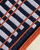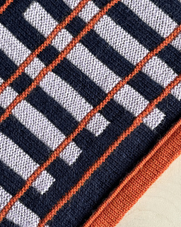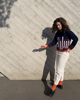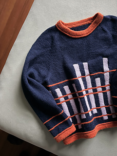 The main graphic columns are created by alternating stockinette and reverse stockinette stitch. This subtle shift in texture lets the shapes appear not only through color, but also through light and shadow. Fine horizontal stripes in a vivid contrast color intersect the fabric at regular intervals, cutting across the vertical structure adding rhythm and movement. The combination of colorwork and texture creates an effect that is architectural yet playful.