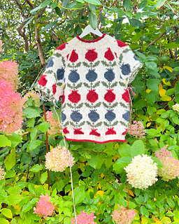 seamlessly from the top down on circular needles, making it easy to try on as you go. The neckline is round and finished with a softly rolled edge in a contrasting accent colour. Short rows are worked at the back of the neck to create a beautiful shape and a more comfortable fit. The body is straight, giving the sweater a relaxed, unisex silhouette that suits both women and men. The sleeves taper gently and are finished with a rib and the same rolled edge as the neckline, tying the whole design together. The bold berry—or seed pod—inspired motifs give the sweater its striking character, making it a joyful and memorable knit.