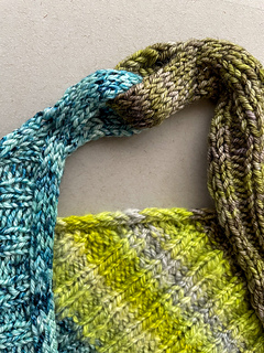 - 42g/142-150yds of soft sportweight wool (main sample shown in Malabrigo Yarn Arroyo in Pocion and Chircas colorways, and hand-dyed handspun yarn scraps)