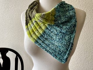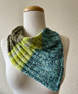 Link Kerchief is a neat triangle with a nice k2, p2 ribbing pattern. It’s a quicker knit in DK yarn, and the sample is shown in scraps of Malabrigo Arroyo and handspun yarn.