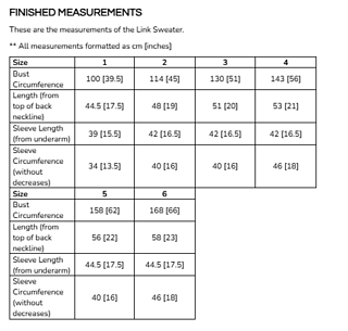 The Link Sweater is designed to have around 20 - 30 cm 8 - 12 inch of positive ease however you can choose your desired amount of positive ease. Sizes 1, 3, and 5 have ribbing down the sides of the body to accommodate multiple sizes and sizes 2, 4, and 6 have a continuation of the cable pattern. In addition, the sleeve circumferences will be slightly different so make sure to take a look at the measurement chart below when determining your size. To calculate your size, measure your bust circumference, add the desired positive ease and use the table to find the body circumference that best matches your value. (The full table is found in the pictures, but I’ve listed the bust circumferences below)