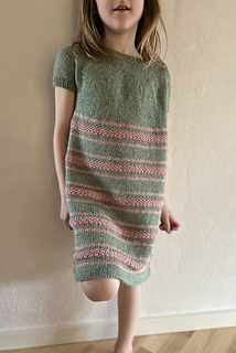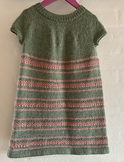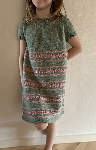 Efter deling til ærmer strikkes kroppen rundt, hvor en udtagningsomgang giver skørtet en blid A-form. Kjolen strikkes i to farver med striber i varierende højde.