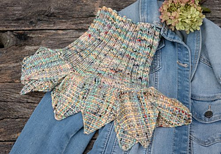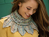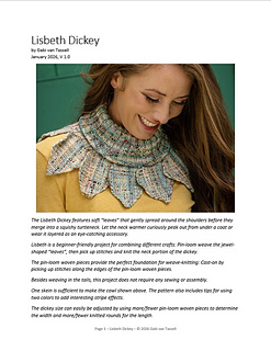 Lisbeth is a beginner-friendly project for combining different crafts: Pin-loom weave the jewel-shaped “leaves”, then pick up stitches and knit the neck portion of the dickey.