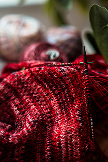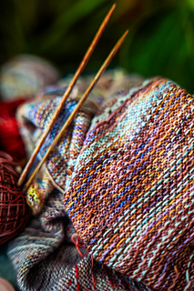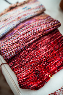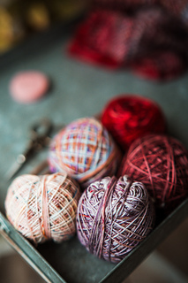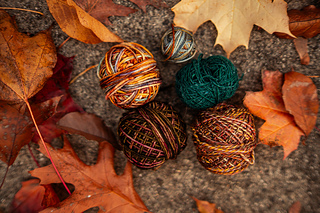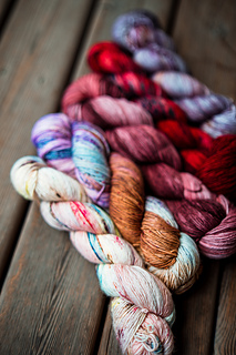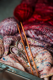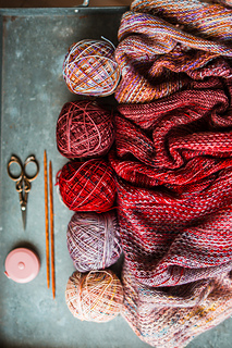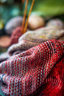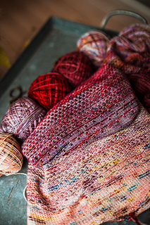 Work the whole thing in fingering weight, all in DK, or hold fingering yarn double to meet DK gauge. Our red sample follows the 5-color fingering version, while the green/autumn sample was knit using the DK 5-color version with a mix of DK scraps, handspun, and fingering held double.