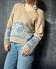 The sweater is worked top-down with a V-neck. A stranded colorwork pattern is worked on the lower body and the lower sleeves. First, the back is worked flat with increases. Then stitches are picked up along the left and right sides of the back to work the front. The left and right fronts are worked separately back and forth with increases to form the V-neck. The front and back are then joined, and the body is worked in the round in stranded colorwork. Stitches are picked up for the sleeves, which are worked in the round with decreases before the colorwork section. Both sleeves and body are finished with a double rib hem. The sweater has a positive ease of 10–25 cm. For an oversized fit, choose a size approx.\ 25–30 cm larger than your bust measurement.