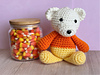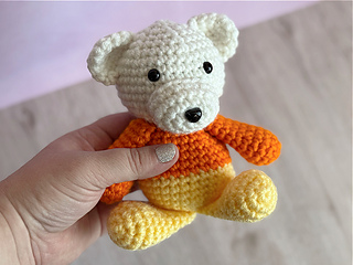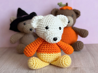 The Candy Corn Bear is the 3rd out of 6 bears in the Bewitching Bears Crochet Along. It sits about 6” tall and is striped in yellow, orange, and white like a candy corn.