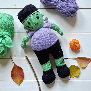 This little Frankenstein doll is knitted flat and seamed, with the arms made separately and sewn on for that classic handmade touch.