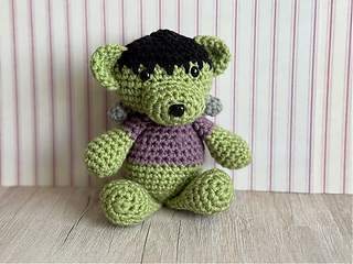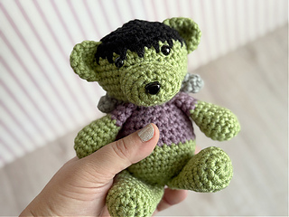 The Little Frankenstein Bear is the fourth Halloween bear in the Bewitching Bears Crochet Along. It joins the Little Witch, Pumpkin, and Candy Corn Bears as the first 4 bears. It is about 6” tall sitting with a little green body, black hair and screws in his neck.