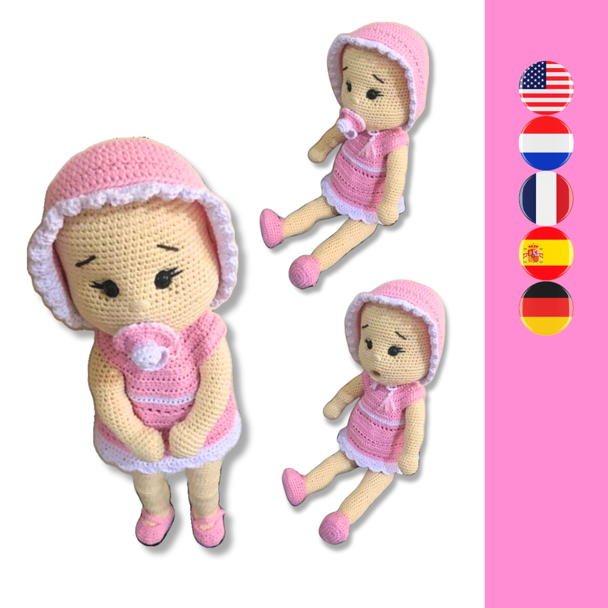 Ze heeft een fopspeentje en draagt een mutsje, een schattig jurkje, een bloeiertje en mary jane schoentjes. De patronen voor al deze dingen zijn bij dit patroon inbegrepen.