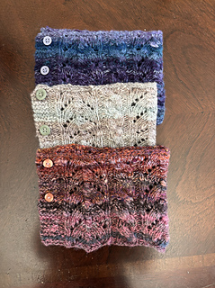This detailed, lace/cabled cowl is knit from the bottom up and measures 15 by 5.5 inches, fitting snugly. The bottom button can be left open, creating a cute split and more coverage below the neck. (It’s perfect for peeking out of a coat.) Or button it up, keeping the warmth above a necklace.