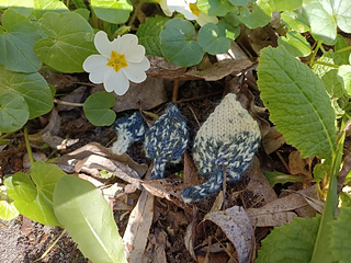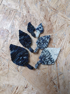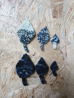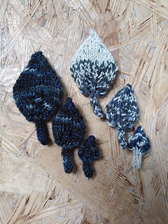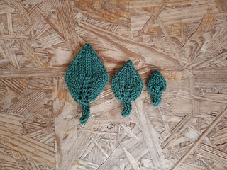 I knitted these leaves with sock / fingering weight yarn, then the finished leaves turn out about 3,5cm/5,5cm/7,5cm long. But really you can knit these with any weight of yarn, the sizes will just be different.