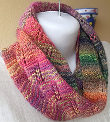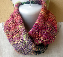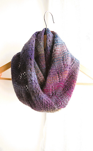 Quick to knit and easy to wear, this cowl is essentially a knit-in-the-round stockinette tube with a half-twist, lifted out of the ordinary by an easily memorized lace pattern, which you can choose to knit once or twice around.