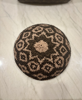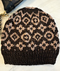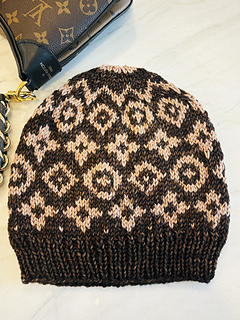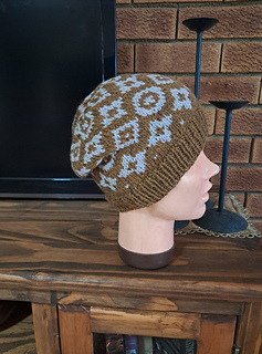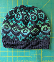 This hat is knit in the round from the bottom up using two contrasting colors in worsted weight yarn. Stranded knitting technique is used. Only two colors of yarn are used at once in patterns are no longer than 7 stitches between yarn colors. Pattern repeats every 20 stitches.