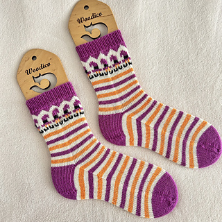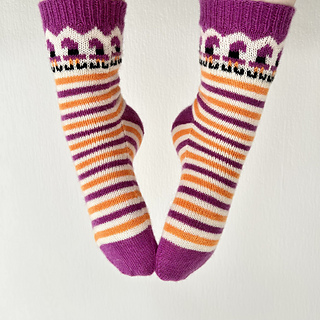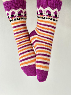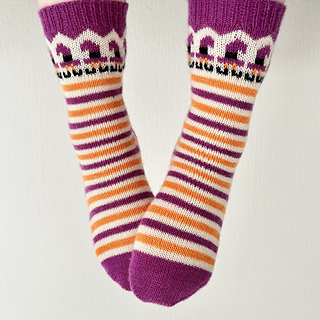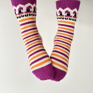 These socks are knit from the cuff down with a section of colorwork on the leg, a reinforced heel with a gusset, and a round toe or a classic pointy toe (two options available).